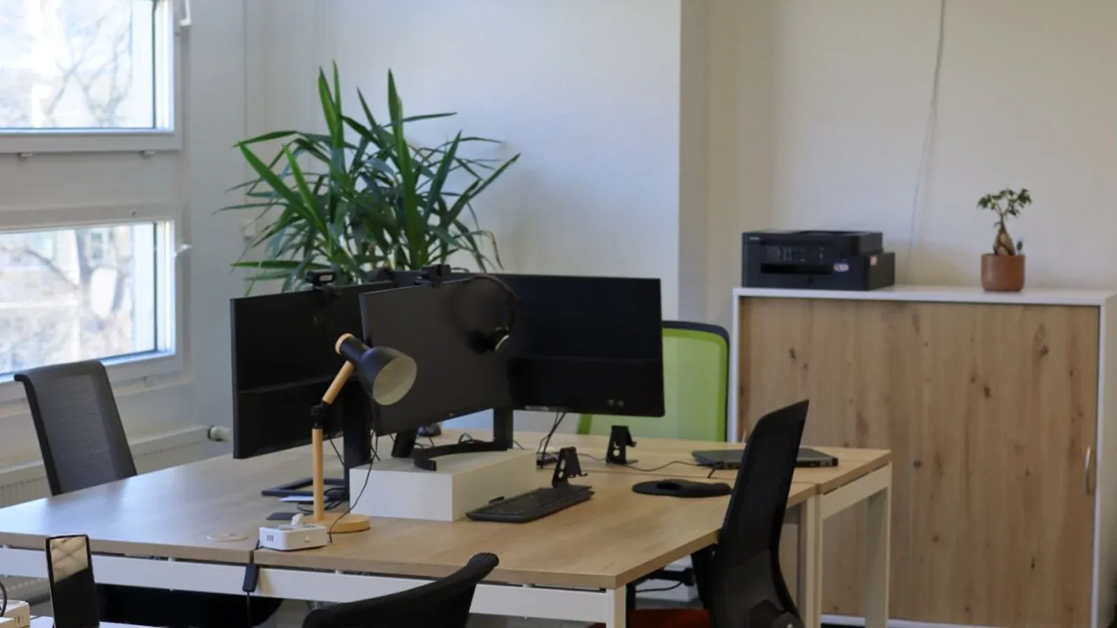 Mehrere Schreibtische, viel Tageslicht, ergonomische Stühle